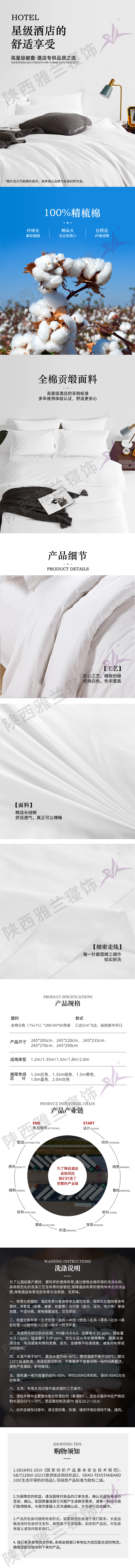交货尺寸:245*205cm。面料:面料:双喷面料,100%棉60S*60S/200*(75+75)漂白贡缎,三边5cm飞边,底部开口加红色线区分尺寸大小,开口内侧加酒店唛头。执行标准:GB18401-2010《国家纺织产品基本安全技术规范》,GB/T22800-2023《旅游饭店用纺织品》