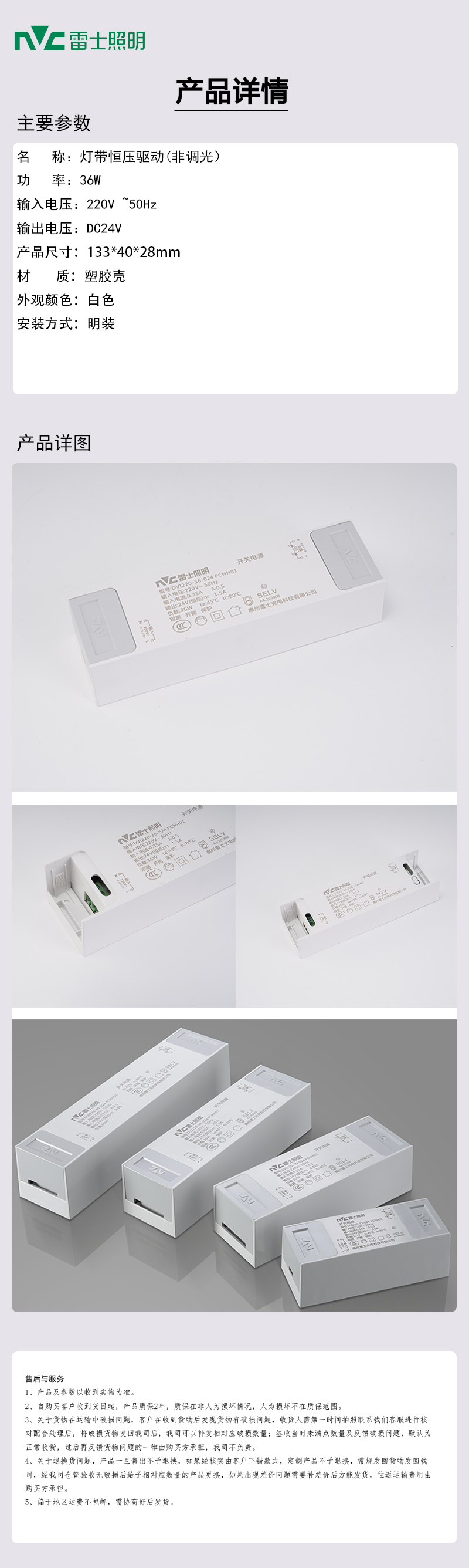 颜色:白色 功率:36W,DC24V 防护等级 IP20 灯体材质 塑胶 灯具尺寸 133*40*28mm 输入电压 220-240V~50/60Hz 功率因数 PF≥0.9 驱动器通过国家统一3C认证标准 |