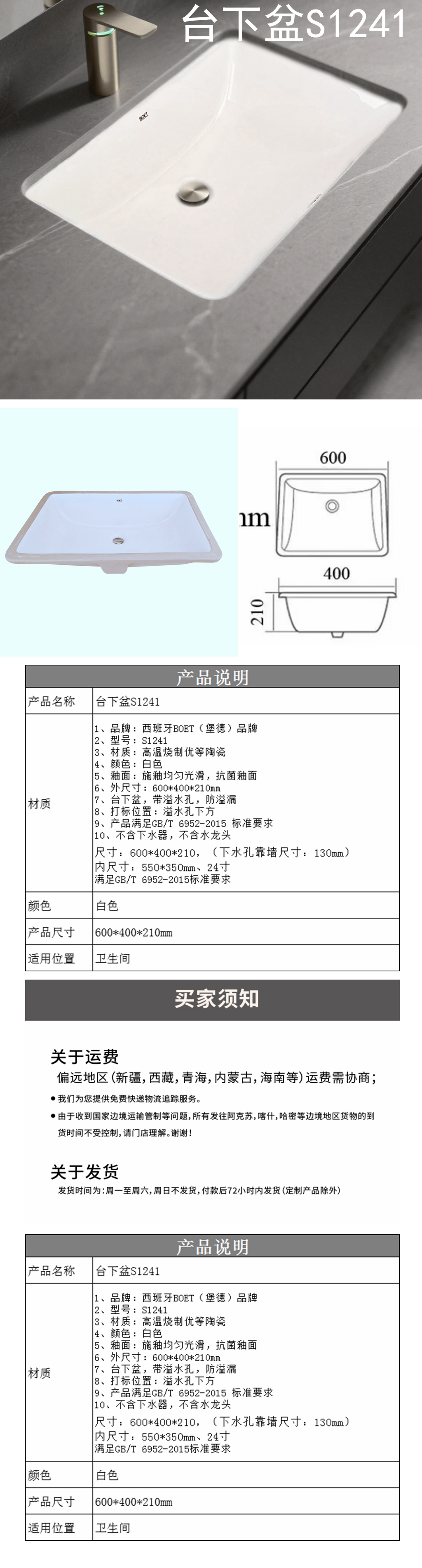 2、型号:S1241 3、材质:高温烧制优等陶瓷 4、颜色:白色 5、釉面:施釉均匀光滑,抗菌釉面 6、外尺寸:600*400*210mm 7、台下盆,带溢水孔,防溢漏 8、打标位置:溢水孔下方 9、产品满足GB/T 6952-2015 标准要求 10、不含下水器,不含水龙头 尺寸:600*400*210,(下水孔靠墙尺寸:130mm) 内尺寸:550*350mm、24寸 满足GB/T 6952-2015标准要求 |
