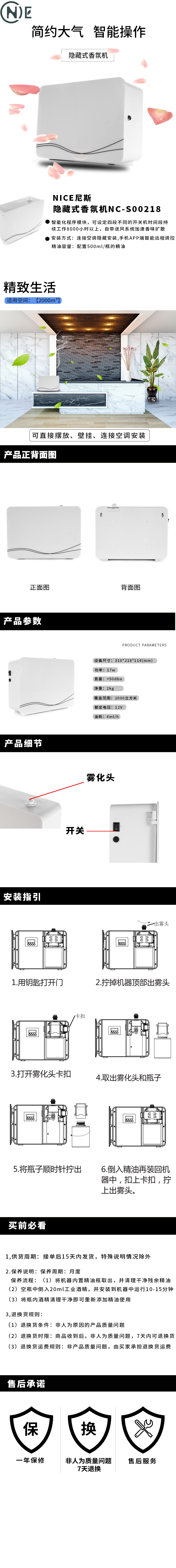 规格:310*112*218mm; 噪音:<50dba; 精油容量:配置500ml/瓶的精油; 安装方式:连接空调隐藏安装; 可在手机APP端智能远程调控 |