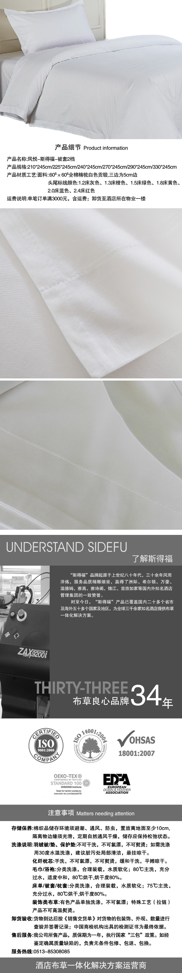 面料:全面精梳白色贡缎,60×60S,173×156, 100%棉。除被头无边外其余三边为5cm压边,尺寸应为交货尺寸;