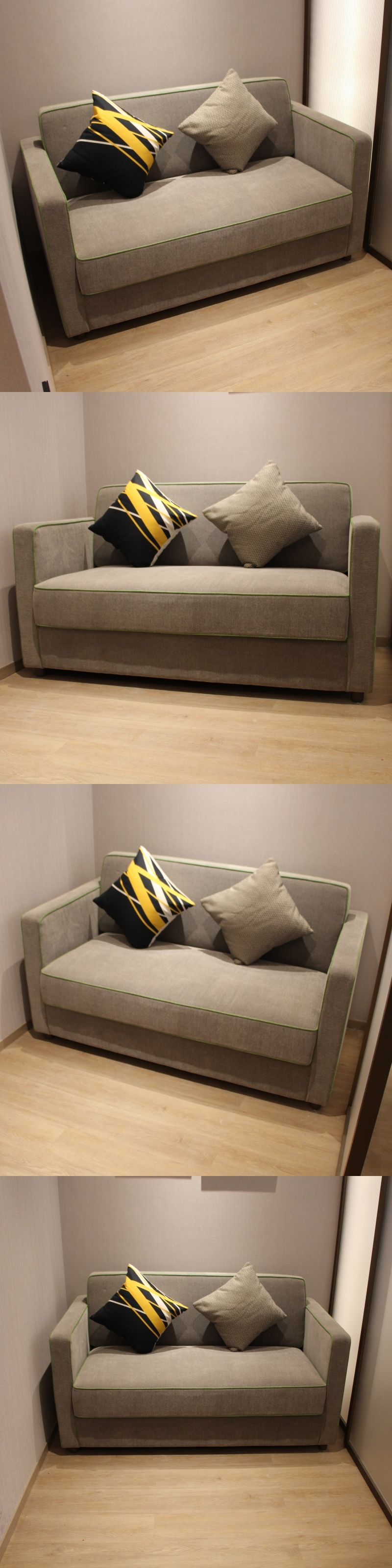 榻600*500*450MM 2、布艺:优质麻布面 料做三防处理(防火,防 水,防污) 3、海绵:高密度、高回弹美标阻燃海绵 4、工艺: 白蜡木实木内架防潮处理,蛇形弹簧加松紧 橡胶带工艺 5、内含折叠五金床架 6、 含抱枕,不含沙发床垫 |